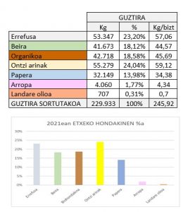 Eta 2021an jasotako hondakinen kopuru eta sailkapenari dagokionez, datuak ondorengoak dira: