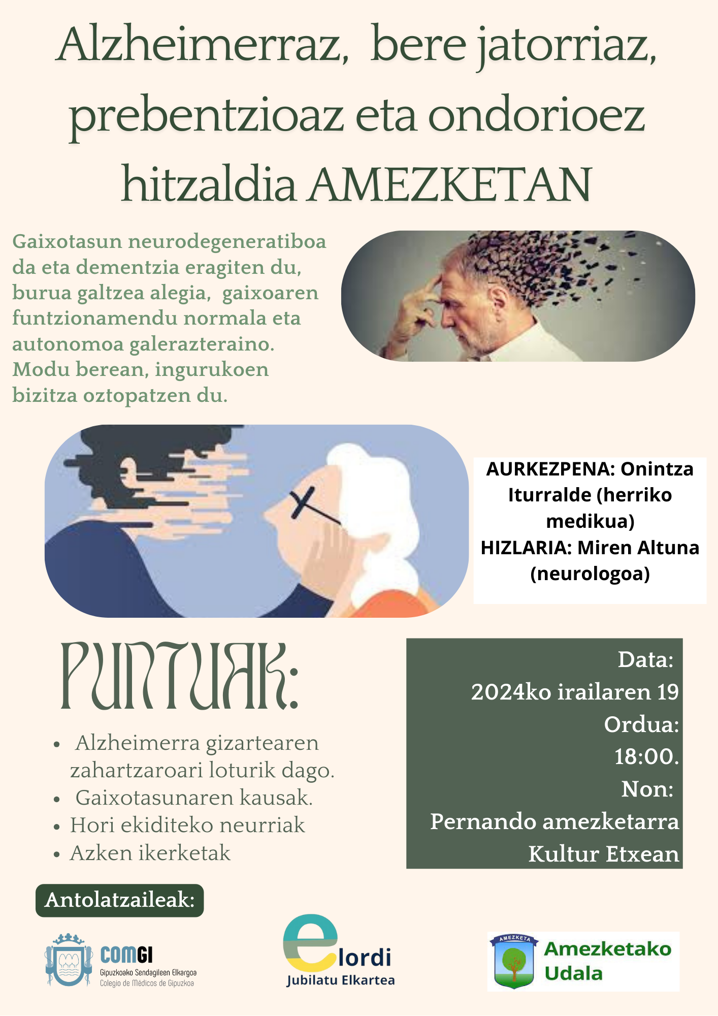 ELORDI Jubilatuen Elkarteak, Gipuzkoako Medikuen Elkargoak eta Amezketako Udalak antolatu dute Alzheimerrari buruzko hitzaldia/tertulia. Gaiak herritar guztiongan du eragina: gaixoengan eta ingurukoengan; izan ere, gaitza zahartzen doan gizartearen seinale bada ere, eragina zabalagoa du eta denontzat da interesgarria horren inguruko ezagutza izatea.