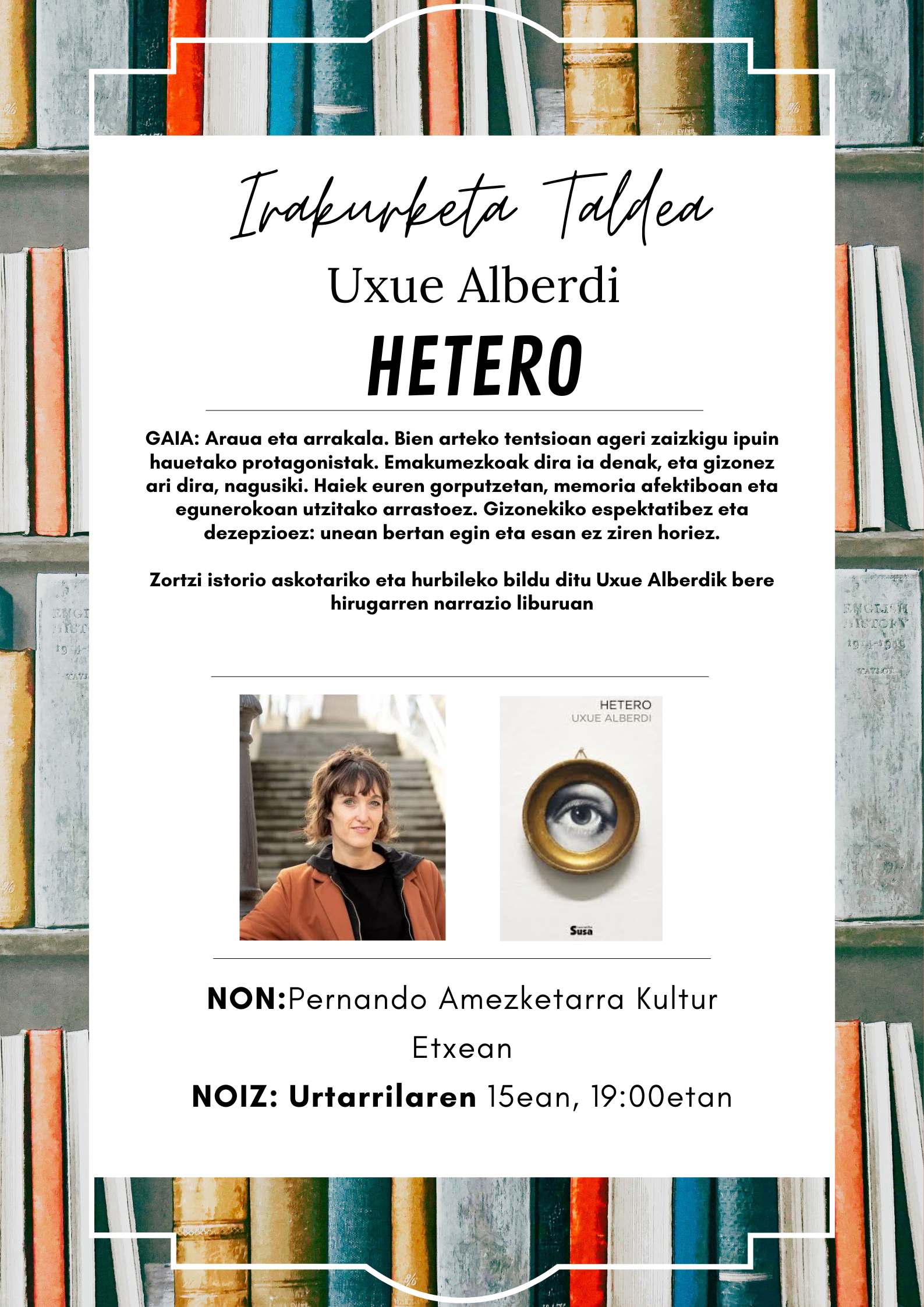 Beraz, ohiturari jarraituz, igaro berri dugun astean hautatu dugu lehen irakurliburua: “HETERO” Uxue Alberdi idazlearena. Hilabete izango dugu irakurtzeko, eta idazlearekin urtarrilaren 15ean bilduko gara Pernando Amezketarra Kultur Etxean, jubilatuen txokoan. Gonbidatuta zaude.