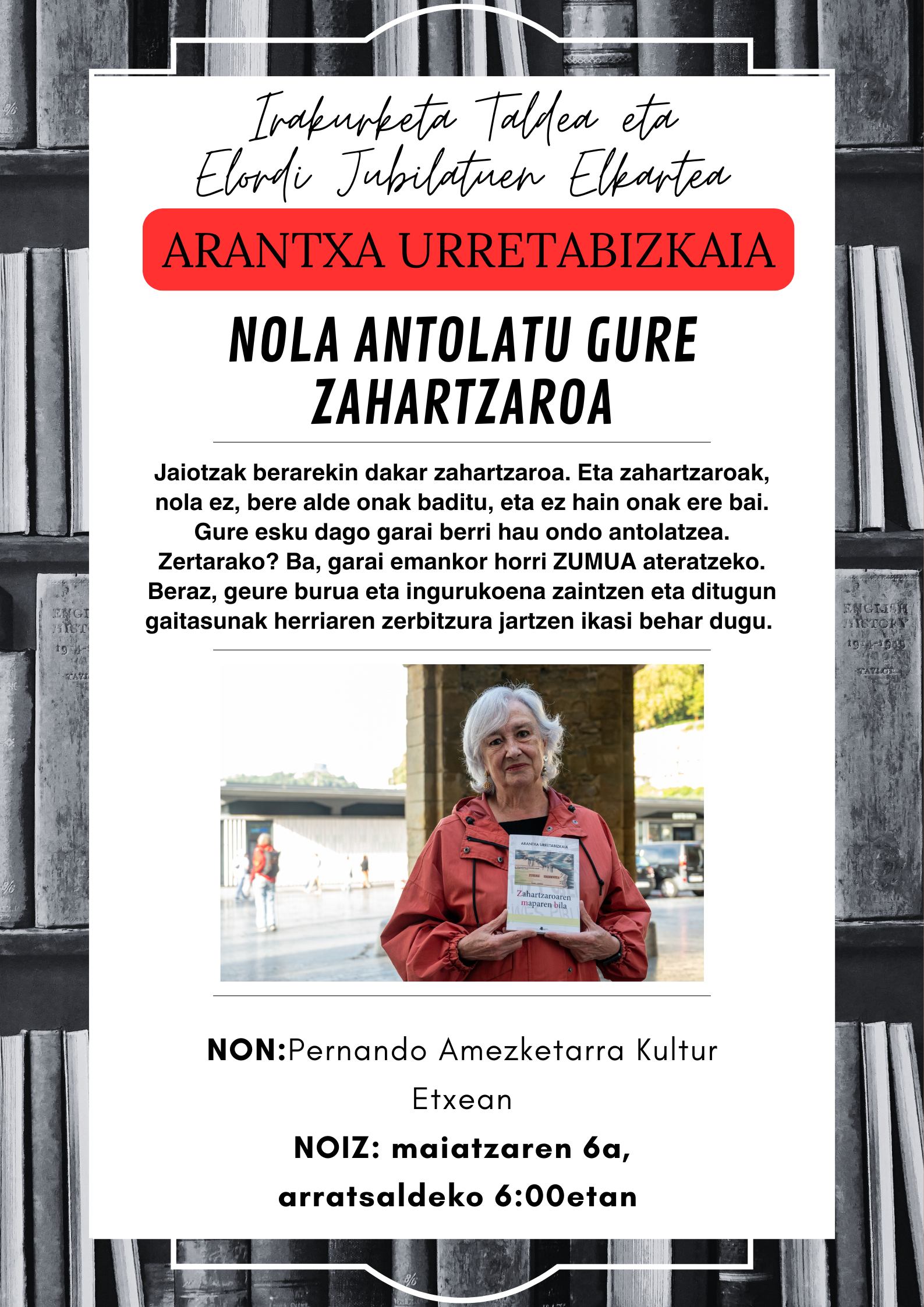 Eta gai zabal horren inguruan, bada Euskal Herrian adinean aurrera doan pertsona jakintsu bat. Idazlea da, pentsalaria da eta telebistan ere aritzen da iritzi emaile. Hori Arantxa Urretabizkaia da. Eta zorte handia dugu Irakurle Taldeak eta Elordi Jubilatuen Elkarteak deituta, gure herrira etortzea onartu duelako.