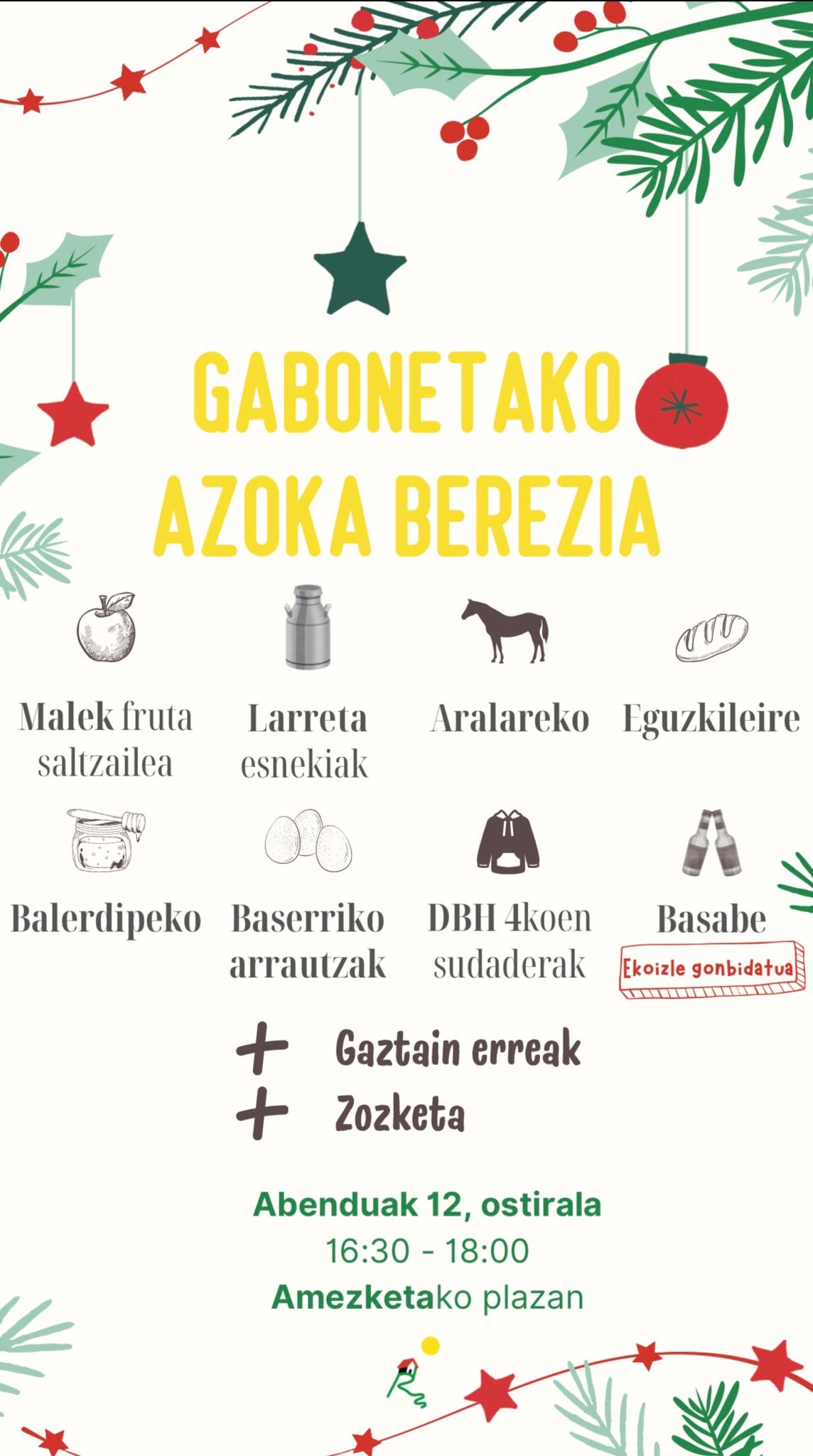 Amezketar guztiak gonbidatuta zaudete giro ederrean tokiko produktuez gozatzera eta gabonetako azoka berezi honetan parte hartzera.
