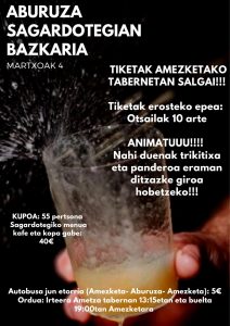 El año pasado comenzamos un nuevo proyecto con los jóvenes del pueblo. Los jóvenes expresaron la necesidad de disponer de un lugar de encuentro y las ganas de organizar actividades en el pueblo, de lo que surgió el Amezketako Gazte Taldea. El Ayuntamiento les ha cedido un buen local de encuentro, y el año anterior los jóvenes organizaron muchas actividades. Siguiendo este camino, el grupo de jóvenes tiene previsto seguir organizando actividades este año, y en esta ocasión han organizado una salida a la sidrería Aburuza. La salida es abierta para todo el pueblo, y la comida se ha organizado para el 4 de marzo. Se pueden adquirir los tickets en los bares de la localidad.