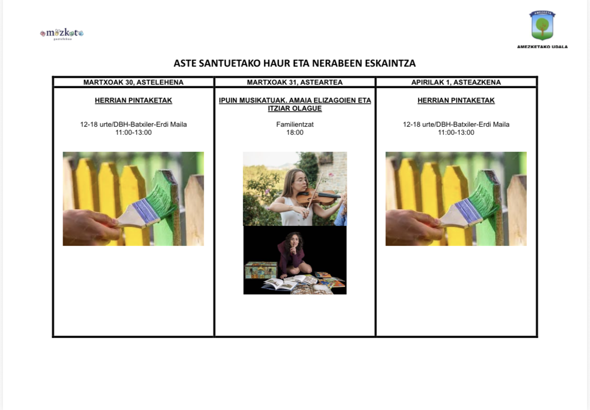 El Ayuntamiento de Amezketa, como todos los años, ha organizado diferentes actividades para la Semana Santa de 2026 dirigidas tanto a niñxs como a adolescentes. El objetivo es ofrecer una oferta de ocio rica y divertida en esta época de vacaciones.