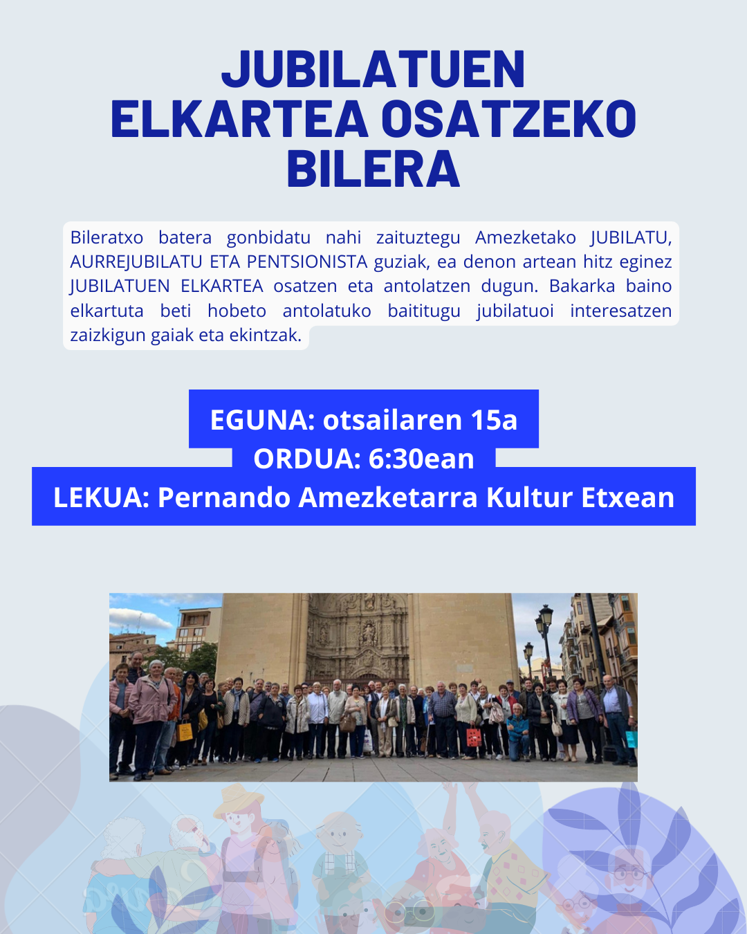 Para hacer referencia a todo ello, analizarlo y recabar el visto bueno de todos se ha organizado una REUNIÓN y se desea que tod@s l@s JUBILAD@S, PREJUBILAD@S y PENSIONISTAS de Amezketa se acerquen a ella.DÓNDE: Pernando Amezketarra Kultur Etxea.