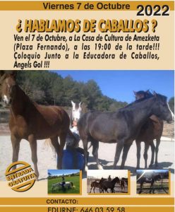 Este viernes, 7 de octubre, a las 7 de la tarde y en la Casa de Cultura, Edurne Barriola ha organizado una interesante charla para hablar de la educación de los caballos.