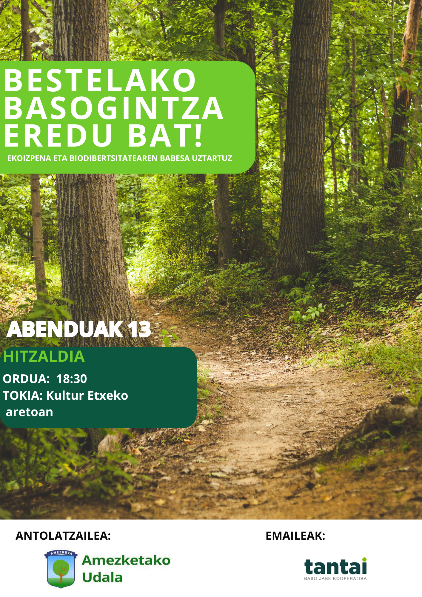 Tantai Baso Jabe Kooperatiba nació preocupada por el rumbo de la silvicultura actual. Proponen un nuevo modelo forestal económicamente viable y respetuoso con el medio ambiente, que tendremos ocasión de conocer en Amezketa.La charla tendrá lugar a las 18:30 horas en la Casa de Cultura Pernando Amezketarra de Amezketa, y todos los vecinos estáis invitados a participar. El objetivo es enriquecer el debate sobre el futuro de los bosques y conocer alternativas más allá del modelo forestal actual.