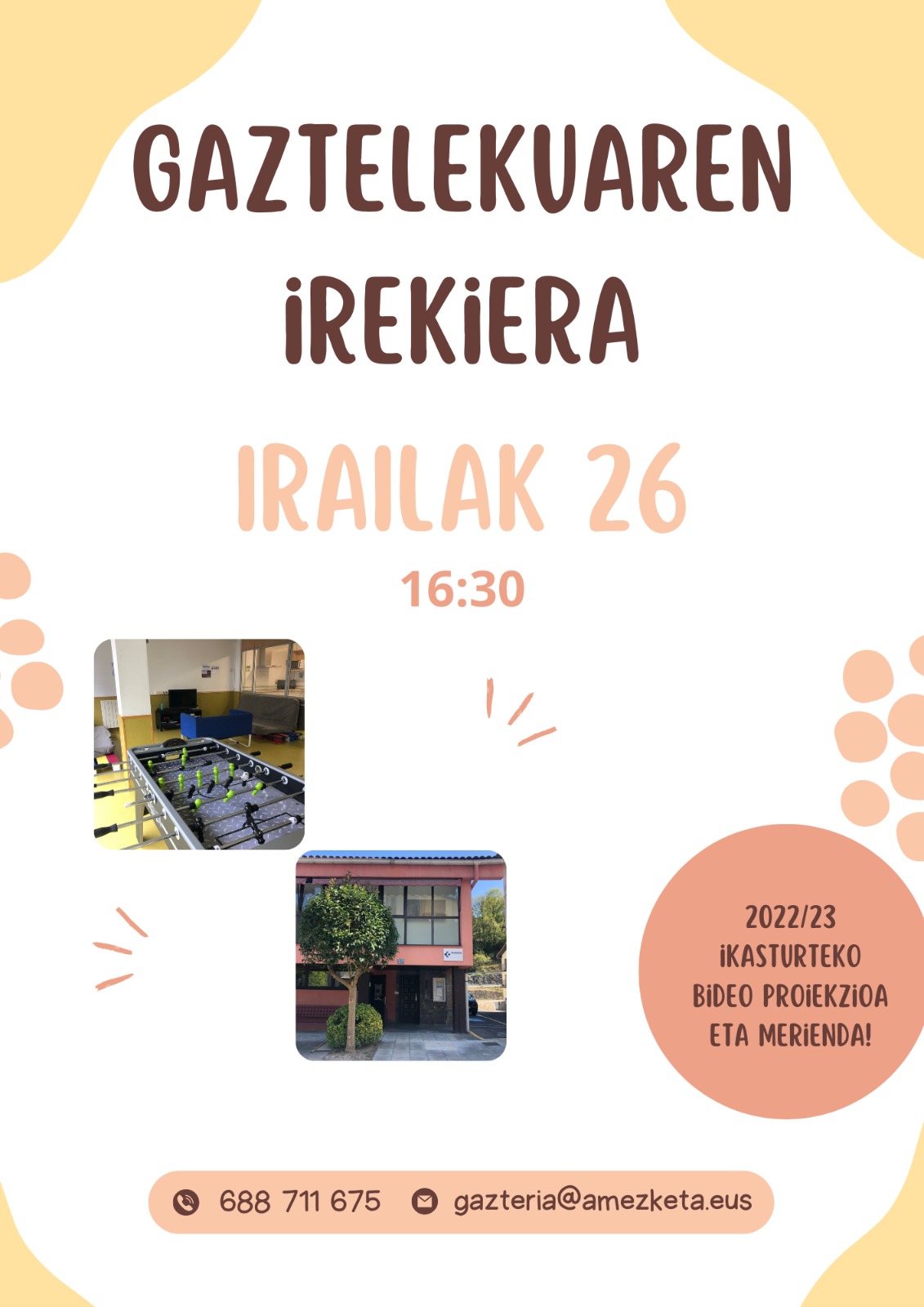 Para l@s adolescentes de 12 a 18 años el servicio del Gazteleku abrirá sus puertas. La apertura será el 26 de septiembre a las 16:30 de la tarde. Allí se abrirá el curso y se proyectará el vídeo del curso anterior. Se mantiene el horario de lunes a viernes de 16:30 a 19:30 horas.