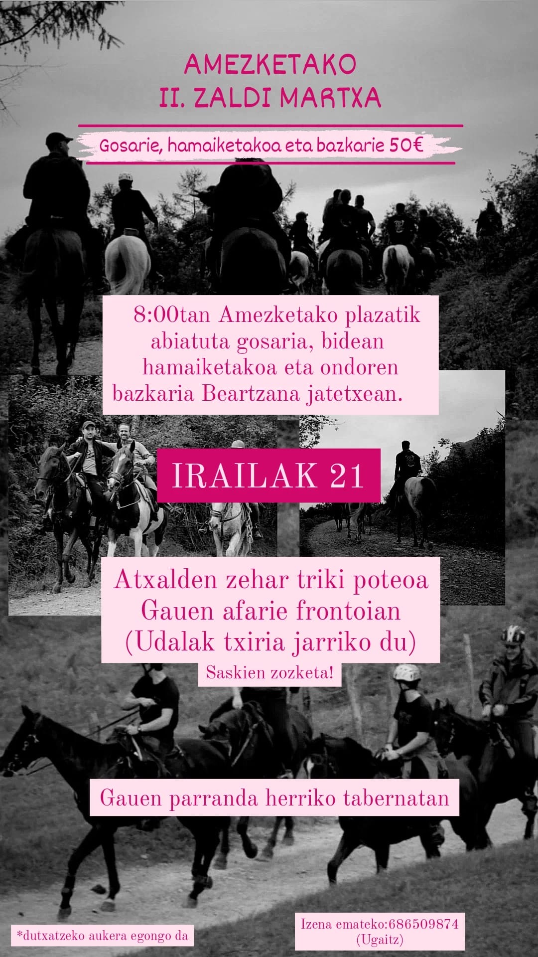El 21 de septiembre, se celebrará la II. Marcha Ecuestre de Amezketa. Un grupo de vecinos y el ayuntamiento, en colaboración, organizaron por primera vez la marcha el año pasado, y visto el éxito, este año se celebrará la segunda edición.