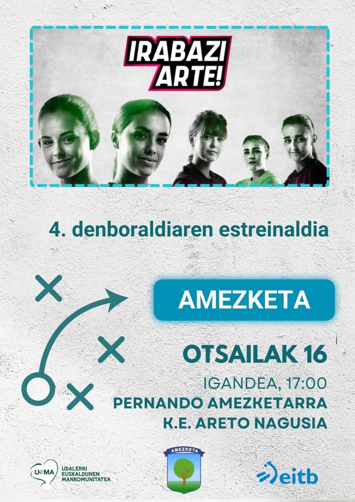 La exitosa serie Irabazi arte! realizará el estreno de su 4ª temporada. Por un acuerdo entre UEMA y EITB, el 16 de febrero, a las 17:00 horas, podremos ver el primer capítulo de la nueva temporada en Amezketa. El estreno tendrá lugar en el Salón de Actos de la Casa de Cultura PERNANDO AMEZKETARRA.
