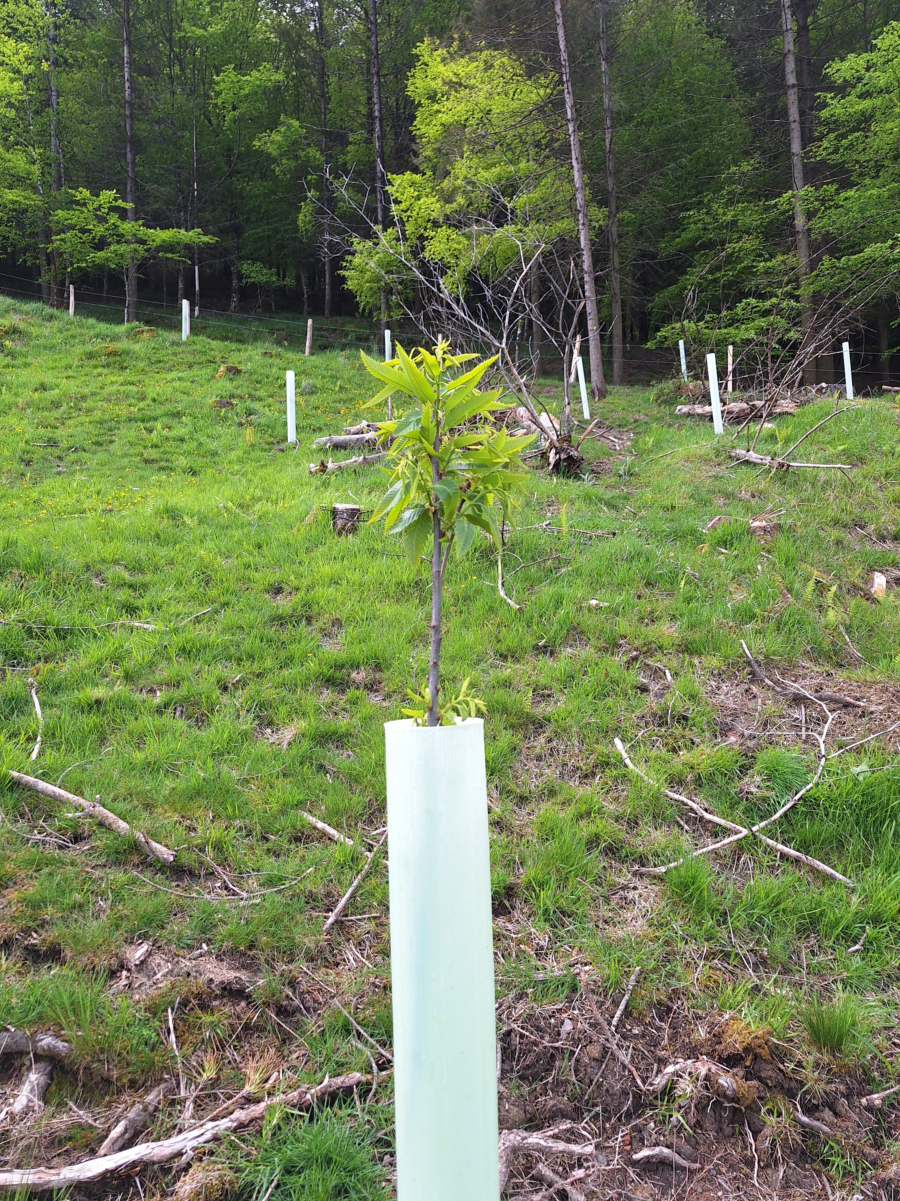 En esta parcela se ha llevado a cabo la plantación de castaños autóctonos, y en colaboración con los guardas forestales de la diputación foral, está previsto realizar injertos utilizando los mentús de los viejos árboles de la zona. El objetivo es hacer frente a las enfermedades que sufren los castaños, reforzando las especies locales y preservando la biodiversidad.