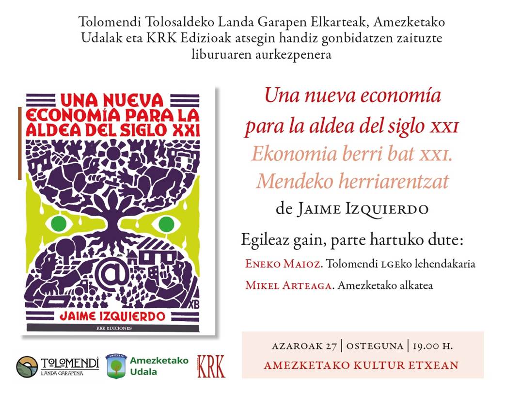 Tolomendi Landa Garapen Elkartea y el Ayuntamiento de Amezketa han organizado la presentación del libro para dar a conocer la obra «Una nueva economía para la aldea del siglo XXI», del escritor Jaime Izquierdo. La presentación tendrá lugar el jueves 27 de noviembre a las 19:00 horas en la Casa de Cultura de Amezketa.