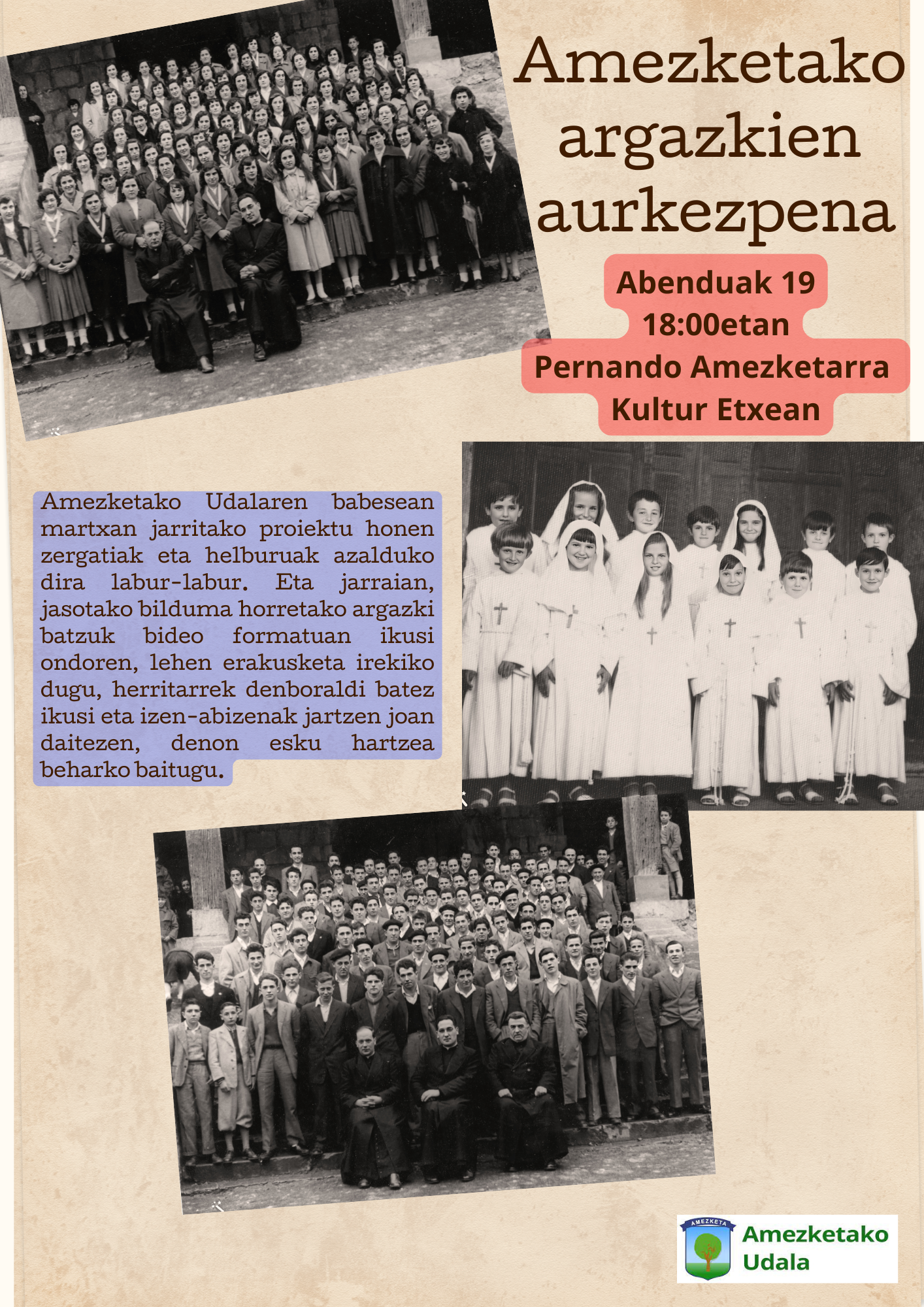 Un grupito de Amezketa lleva un año recopilando fotografías antiguas, ya de por sí importantes, que de no hacerlo se pueden perder. Fruto de este trabajo, la PRIMERA EXPOSICIÓN se organiza con unas fotografías que reflejan y expresan la religiosidad vivida en profundidad por nuestros padres/madres y predecesores/as en Amezketa.