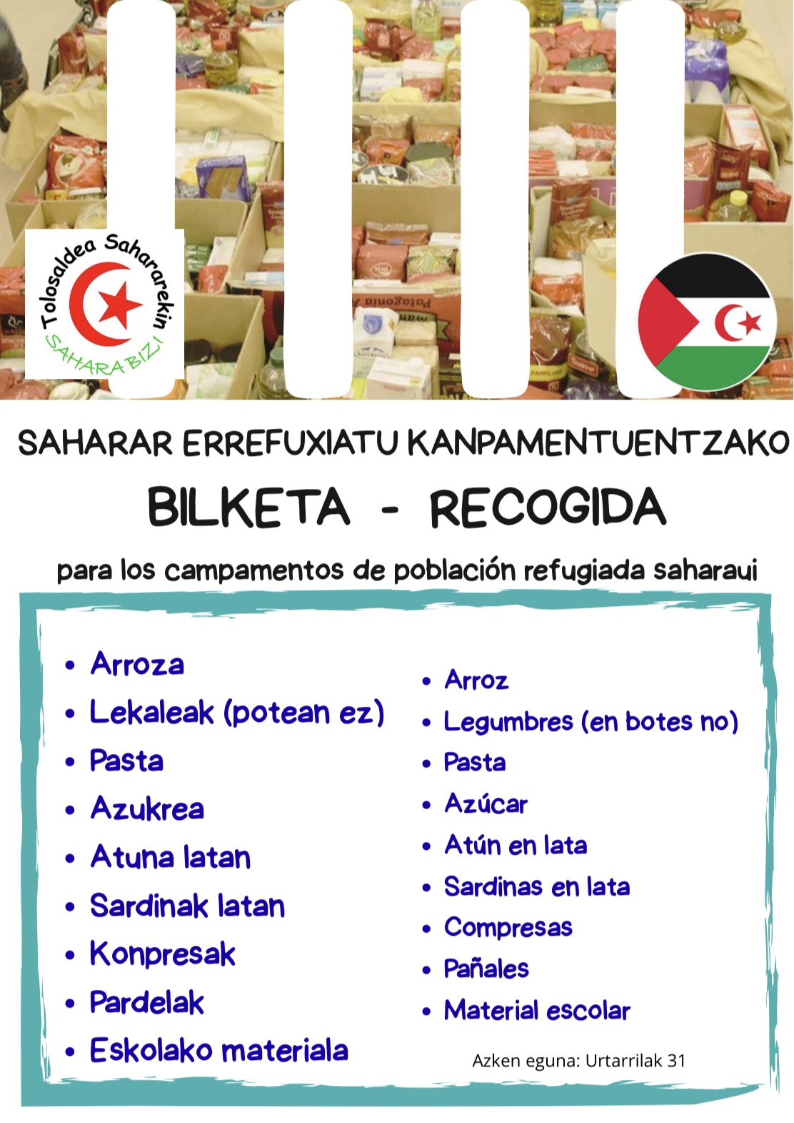 La Asociación Tolosaldea Sahararekin se ha puesto en contacto con nosotros con motivo de la RECOGIDA que se llevará a cabo en la comarca. En el caso de Amezketa, la recogida se realizará del 26 al 31 de enero. El punto de recogida se encuentra en el ayuntamiento, en el espacio que se habilitará en la entrada.