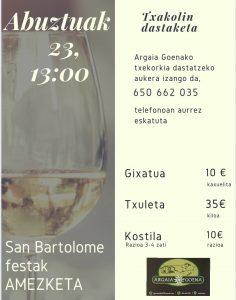 Aurrekoan esan bezala hemen ditugu herriko San Bartolome festak. Egitarauean irakurri daiteke, aurten Txakolin Dastaketako egunean (abuztuak 23, 13:00), Argaia Goenako txekorkia dastatzeko aukera izango dutela bertaratzen direnek. Horretarako, beharrezkoa da aurrez 650 662 035 telefonoan eskaria egitea. Informazio gehiagorako ikusi erantsita doan kartela. Ondo pasa festetan!