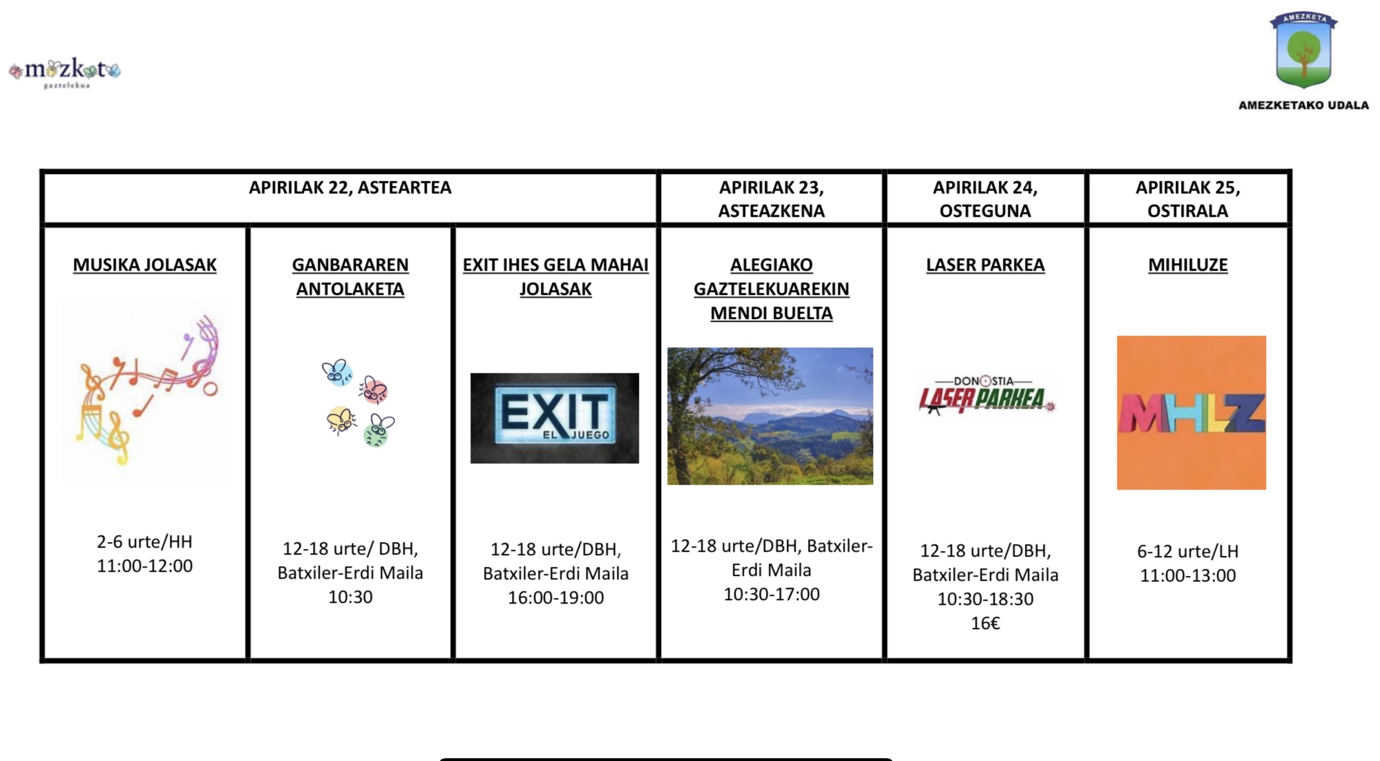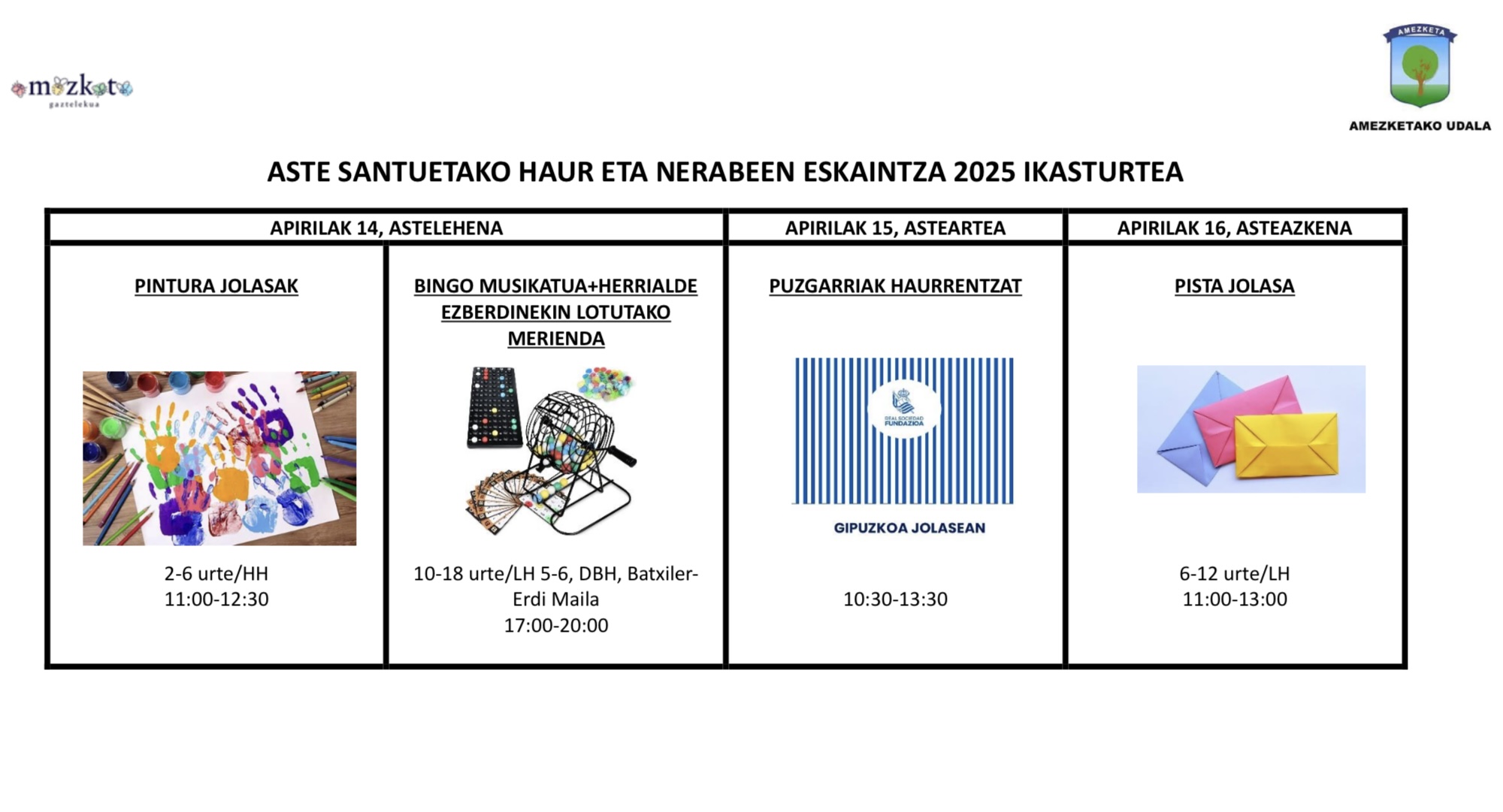 Amezketako Udalak, urtero bezala, 2025eko Aste Santurako ekintza ezberdinak antolatu ditu bai haurrei bai nerabeei zuzenduta. Helburua, opor garai honetan aisialdi eskaintza aberatsa eta dibertigarria eskaintzea da.