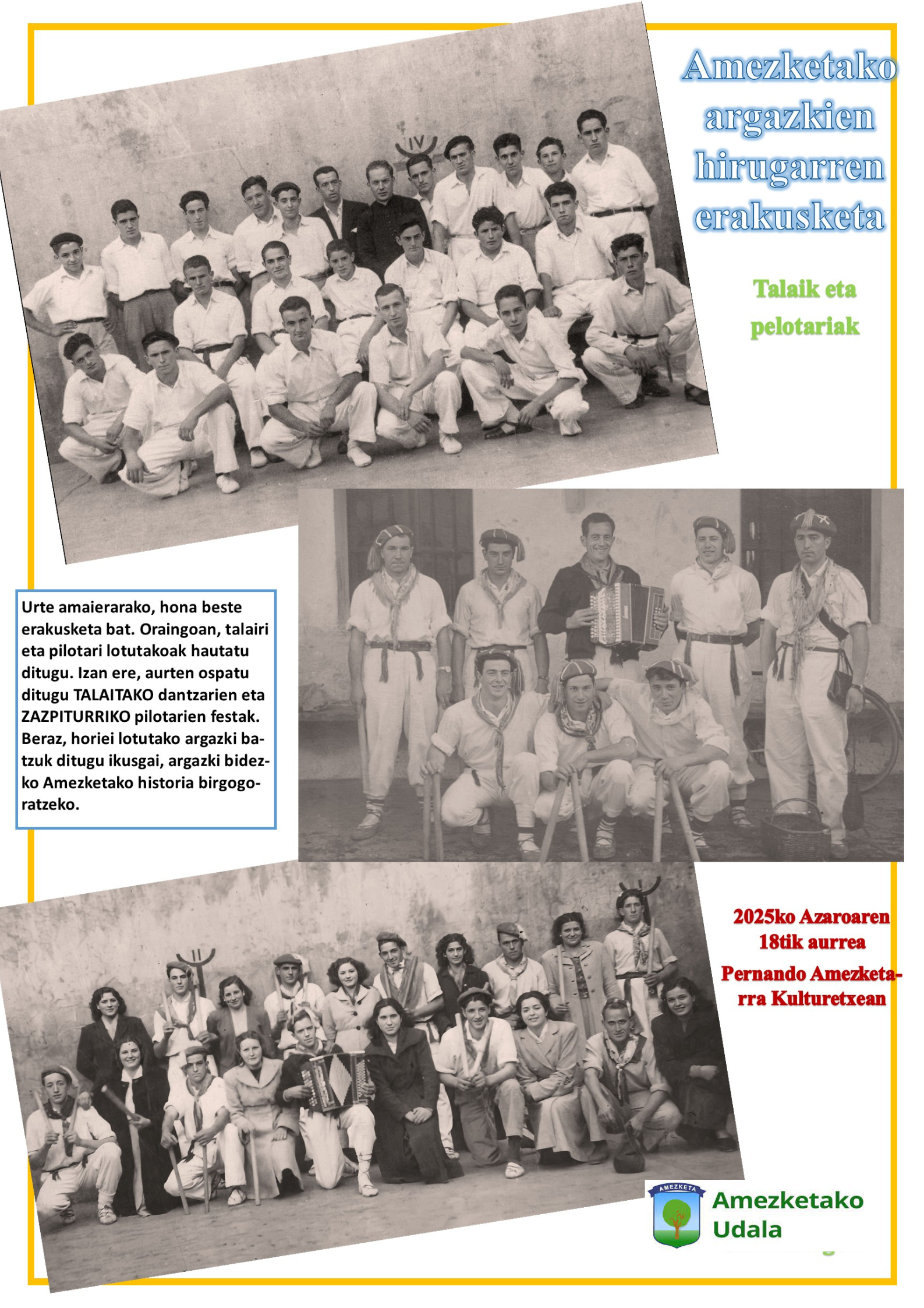 Oraingoan bi gairi lotutakoak jarriko dituzte ikusgai: “Amezketako talaik” eta “pilotariak”. Izan ere, aurten ospatu ditugu herrian talai  festa eta pilota festa. Zer egokiago,  beraz, bi gai horiei lotutako argazki batzuk eskaintzea baino.