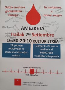 Ostiral arratsaldean, irailak 29, Amezketako Kultur etxean, 16.30tatik 20.10arte, odola eman ahal izango da.