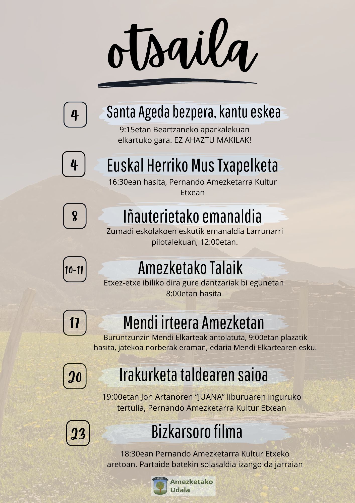 Otsailean sartu gara eta prest dugu hilabete honetarako emanaldi eta ekintzaz betetako agenda. Denetariko ekintzak izango dira herritar guztien gozamenerako. Atsegin izango zaizkizuelakoan…
