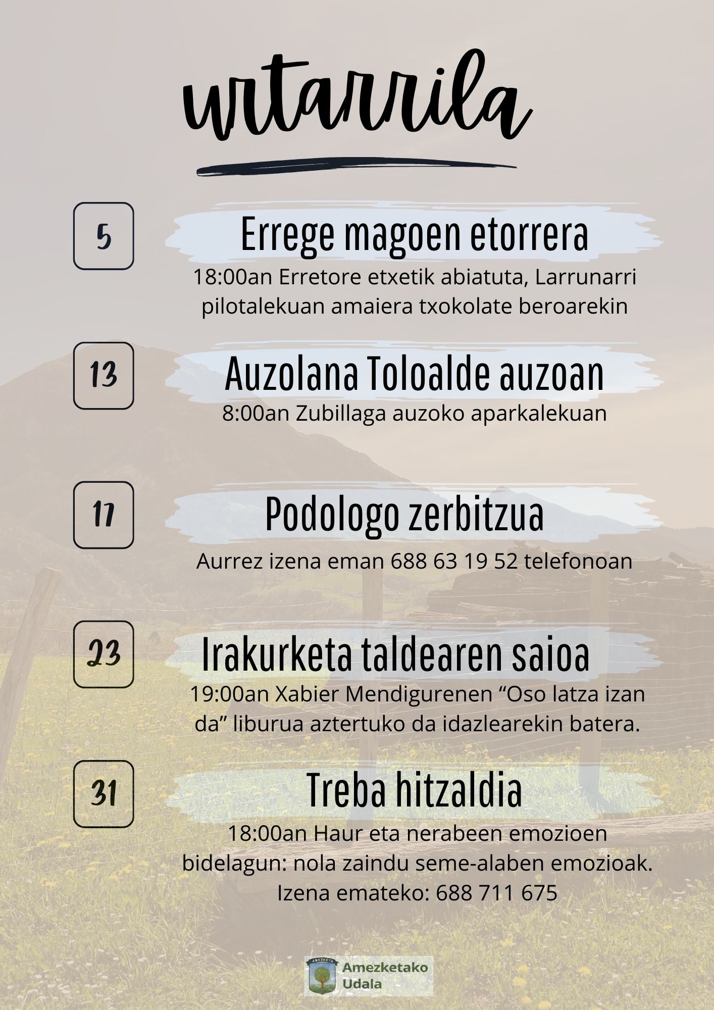 Amezketak bizirik jarraitzen du! Urte berriari hasiera eman diogu, hemen da urtarrila eta hemen dituzue hilabete honetan zehar herrian izango diren ekintza ezberdinak. Animatu parte hartzera!