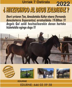 Ostiral honetan, urriak 7, arratsaldeko 7etan eta Kultur Etxean, hitzaldi interesgarri bat antolatu du Edurne Barriolak zaldien heziketaz hitzegiteko.